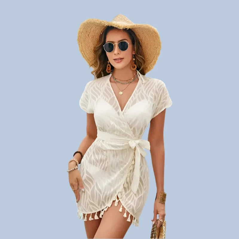 Effortlessly chic, this cover-up lace dress brings breezy sophistication to poolside lounging with its sheer textured fabric and playful tassel trim. A tie waist and draped silhouette create a flattering shape perfect for beach days or resort getaways.