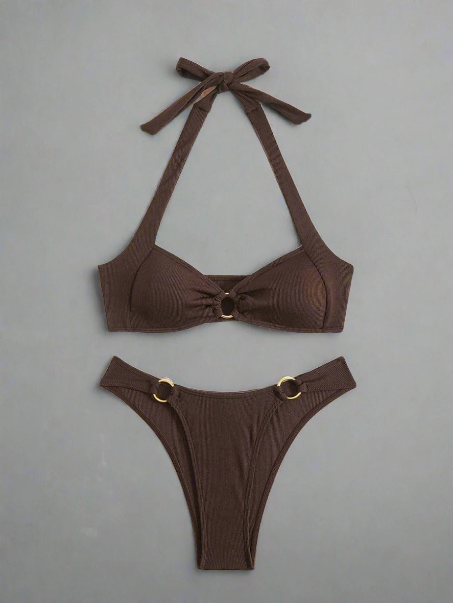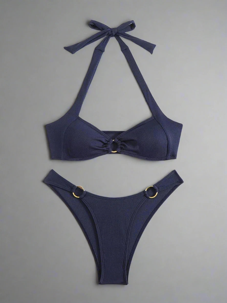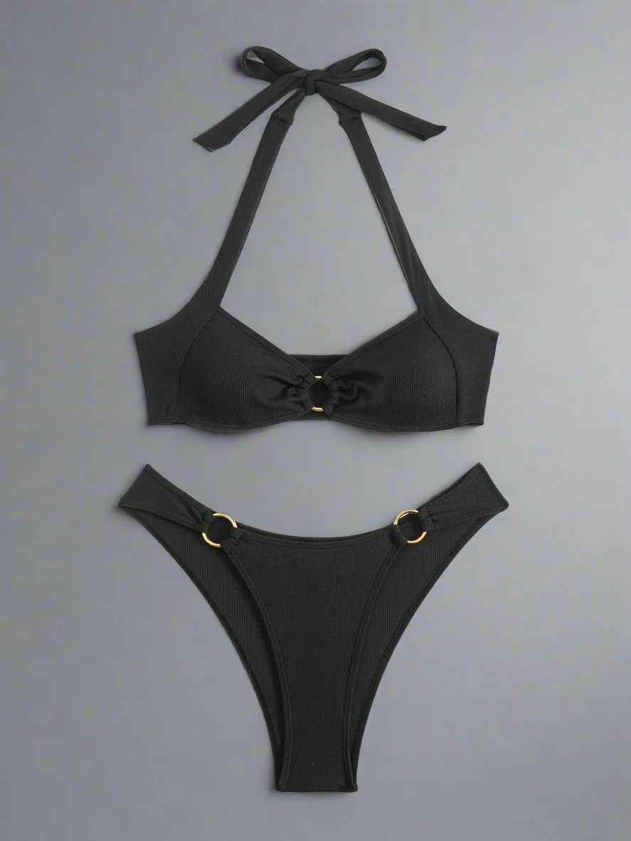 Chic and supportive, this halter bikini set features sleek ring accents and a flattering high-leg cut for a confident, sculpted beach look. Designed for both lounging and swimming, it balances bold detail with timeless style.