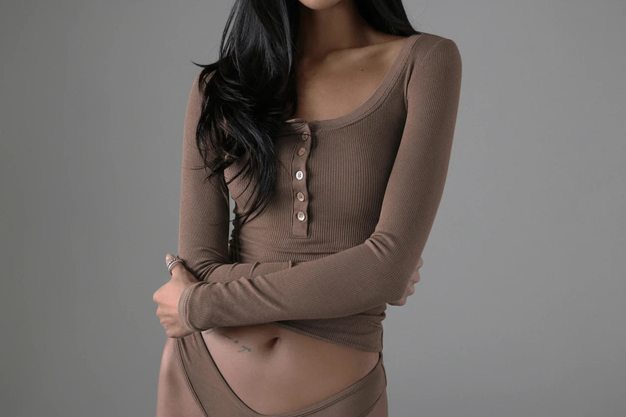 Softly contoured and effortlessly cool, this long-sleeve ribbed top features a flattering scoop neckline with a button-front placket for a modern, feminine finish. Designed with a slim, body-skimming fit, it’s the perfect elevated essential for layering or wearing solo.